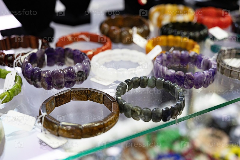 Ассорти из драгоценных камней, представленных на стеклянной полке, яркие цвета, внутренняя обстановка. Концепция модных аксессуаров и ювелирных изделий