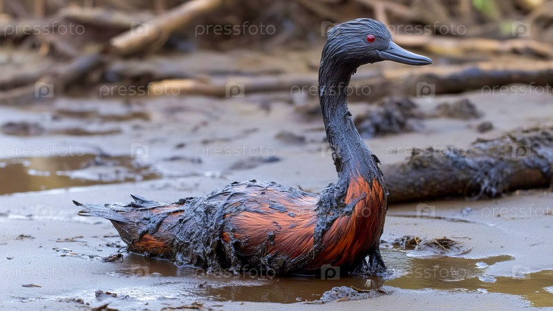 Водоплавающая птица, покрытая нефтью, на загрязненном пляже