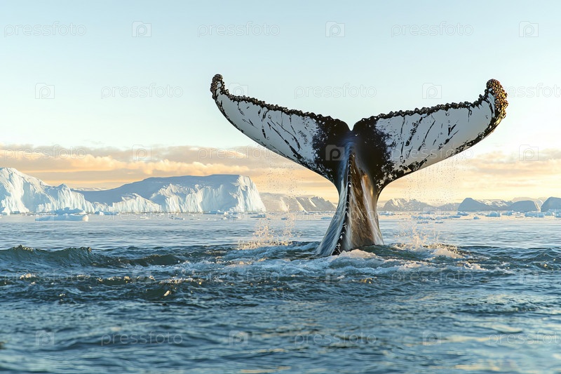 Кит ныряет у берегов Гренландии, окруженный ледяными водами, на фоне прибрежного пейзажа