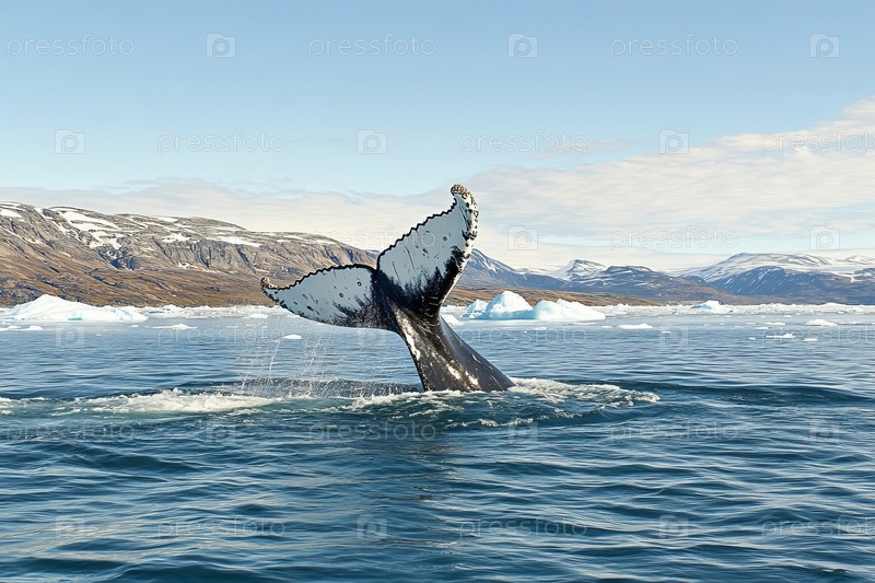 Кит ныряет у берегов Гренландии, окруженный ледяными водами, на фоне прибрежного пейзажа