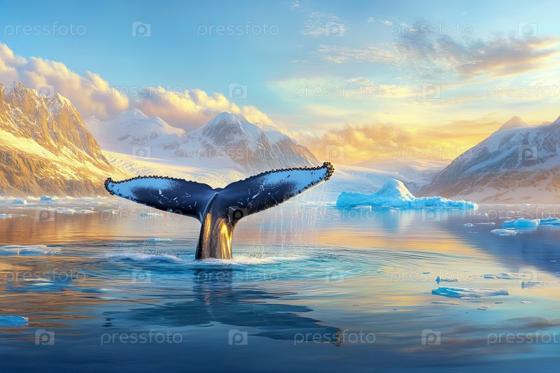Кит ныряет у берегов Гренландии, окруженный ледяными водами, на фоне прибрежного пейзажа