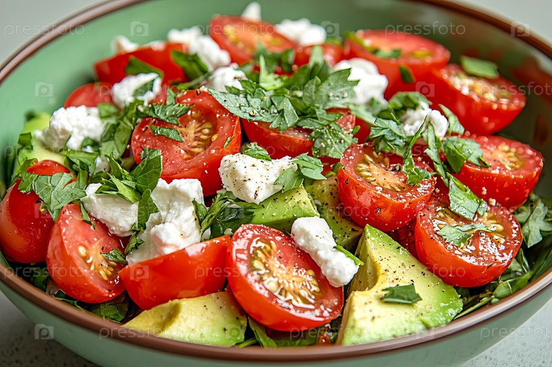 Салат из свежего авокадо с помидорами черри, сыром и зеленью в миске