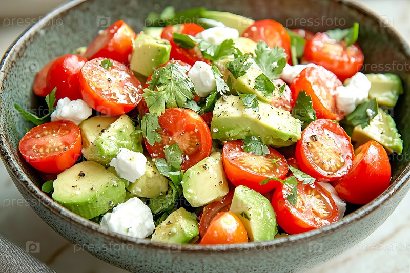 Салат из свежего авокадо с помидорами черри, сыром и зеленью в миске