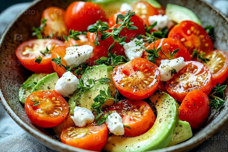 Салат из свежего авокадо с помидорами черри, сыром и зеленью в миске