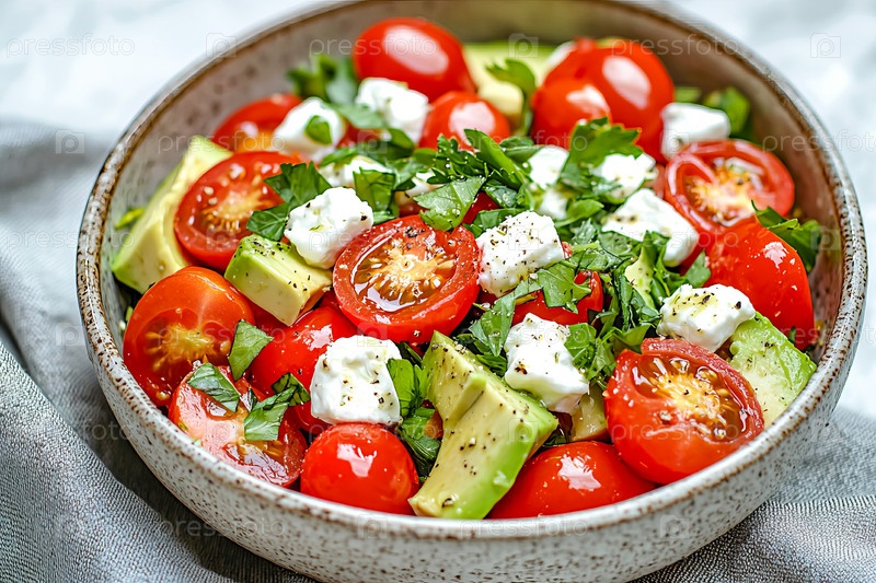 Салат из свежего авокадо с помидорами черри, сыром и зеленью в миске