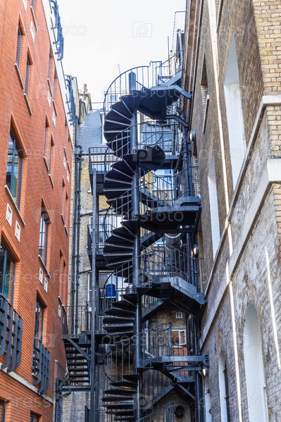 Наружная аварийная винтовая лестница, извилистая между городской архитектурой