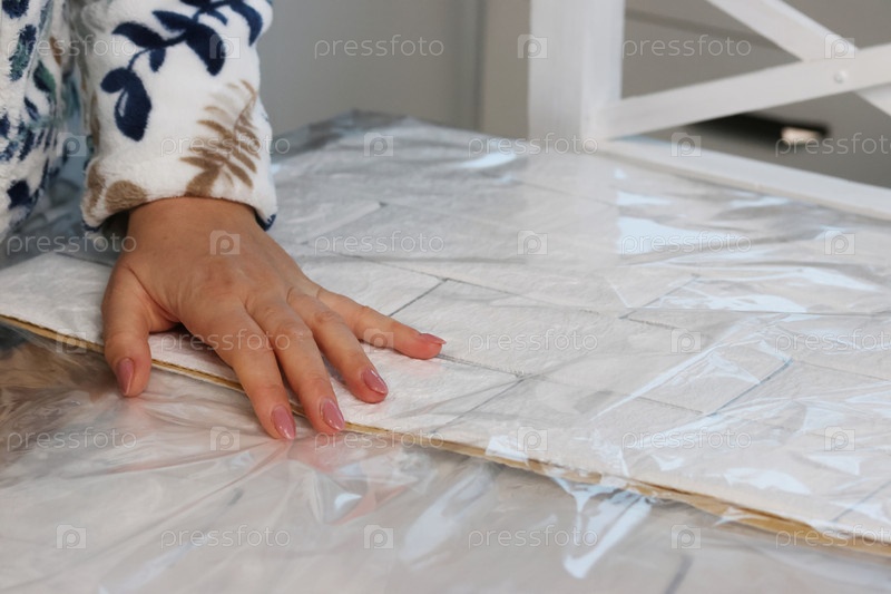 Женщина распаковывает и рассматривает самоклеящиеся стеновые панели. Панели имеют рельефный рисунок кирпича