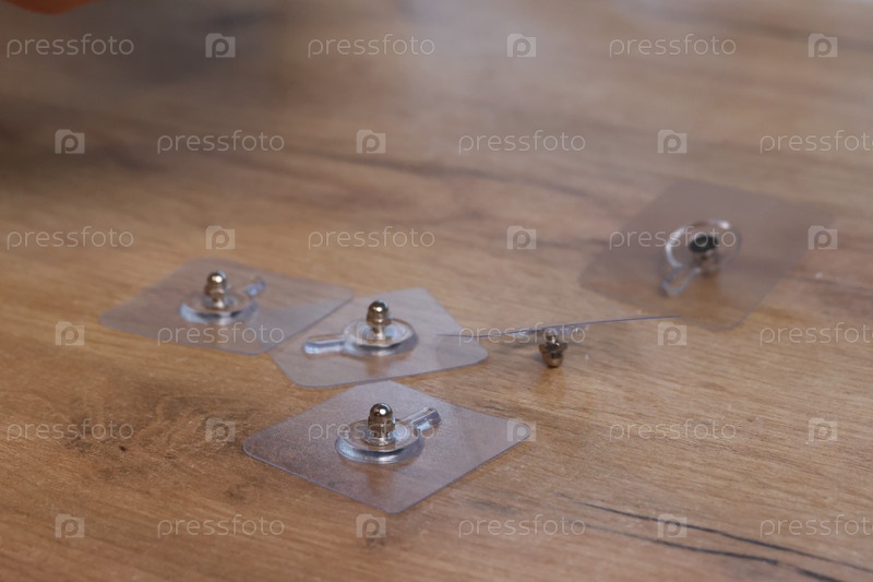 Самоклеящиеся держатели. Разложены на столе. Крупный план
