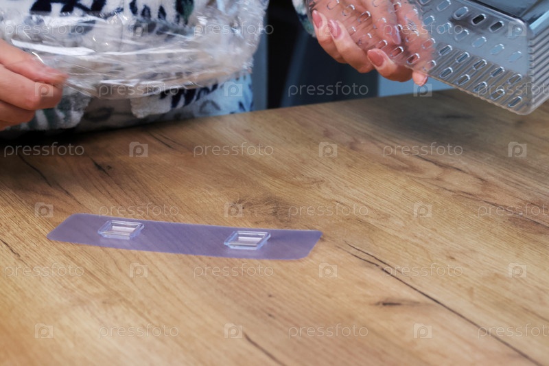 Женщина держит пластиковую полку для ванной. Рядом с ней на столе лежит кронштейн для крепления полки. Она делает обзор покупки