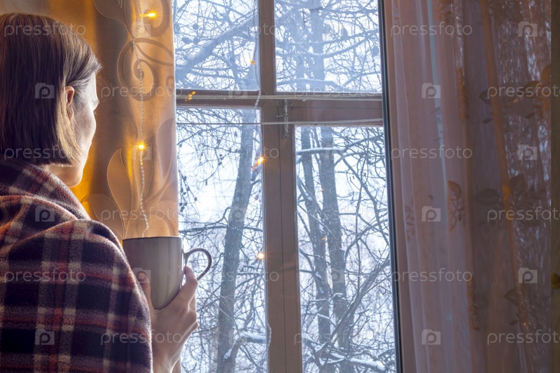 Неузнаваемая женщина с чашкой кофе стоит у окна, закутавшись в уютный плед, и любуется зимним пейзажем. уютное времяпрепровождение. Вид сзади
