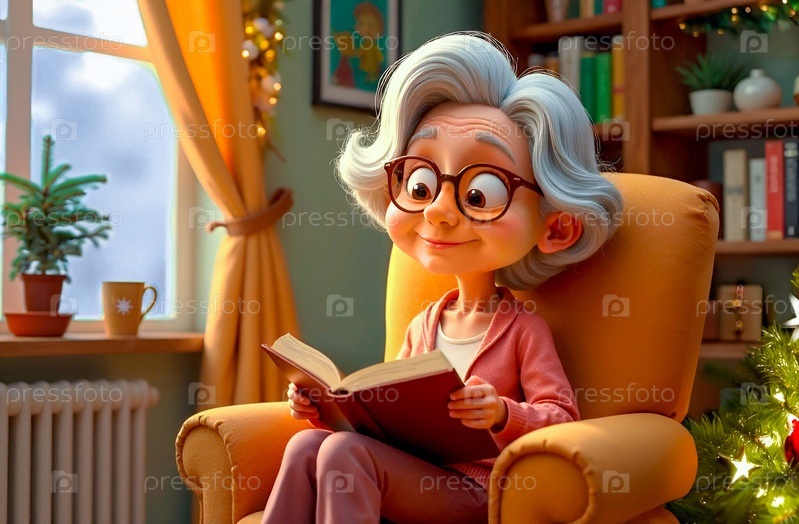 Пожилая женщина читает книгу, сидя в уютном кресле у себя дома рядом с рождественской елкой. Забавный мультяшный стиль. Рождественские традиции