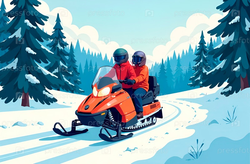 Пара в защитных шлемах и спортивной одежде спускается с горы на снегоходе. Зимние виды спорта
