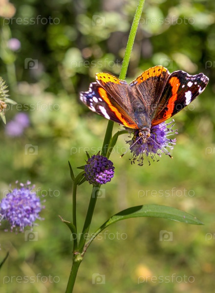 Бабочка Ванесса Аталанта на луговом цвете Succisa pratensis
