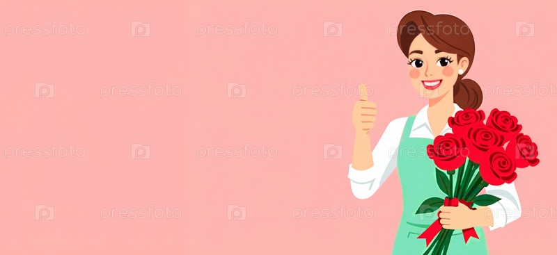Девушка-флорист в рабочем фартуке с поднятым вверх большим пальцем держит букет роз, показывая, насколько хорош ее продукт. Розовый баннер с местом для текста
