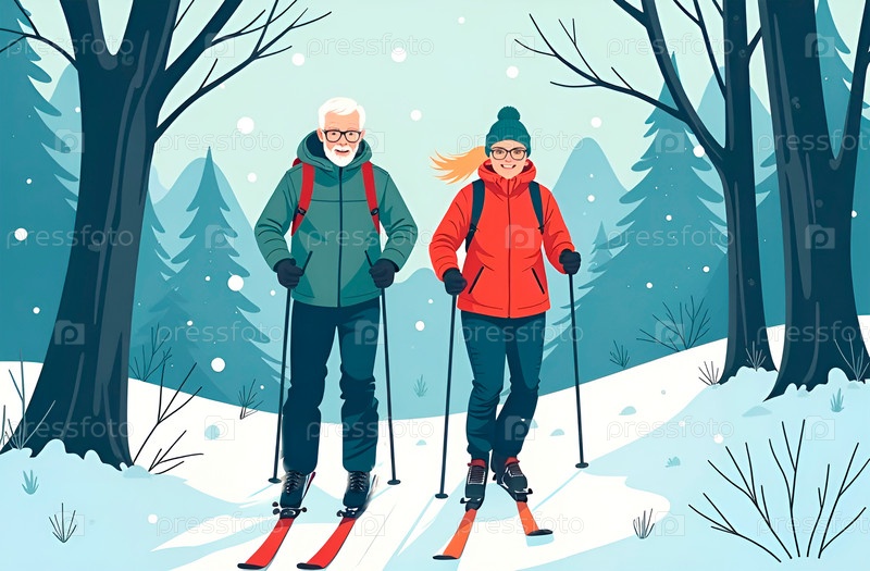 Пожилой мужчина и молодая женщина в спортивной одежде катаются на лыжах в зимнем лесу. Мезальянс, неравный брак. Отец и дочь