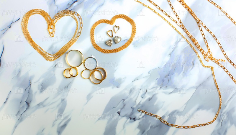 Золотая ювелирная композиция ко Дню святого Валентина. Кольца, цепочки в форме сердца расположены на мраморе. Место для копирования, для текста