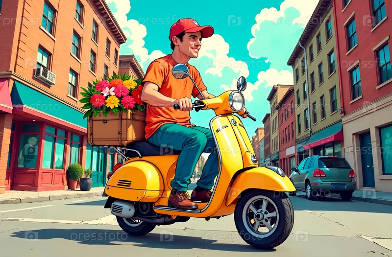 Курьер на скутере, доставка цветов на праздники. День святого Валентина, день рождения