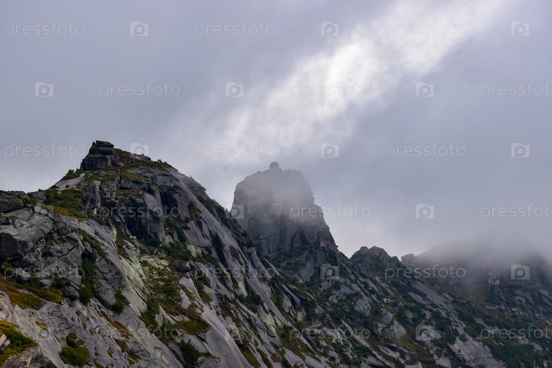 Горы, туман, горный пейзаж, Ергаки, лето, мегалиты, горная тайга