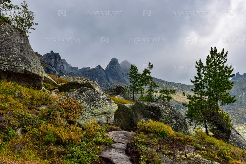 Горы, туман, горный пейзаж, Ергаки, лето, мегалиты, горная тайга
