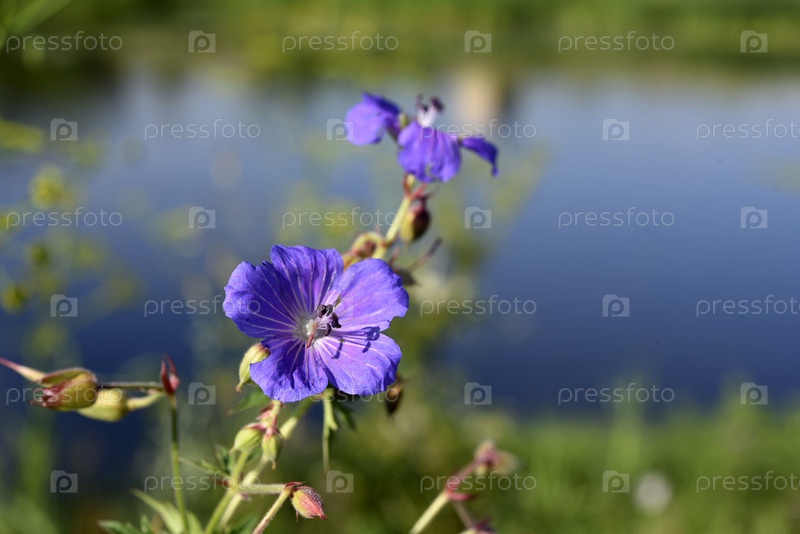 Фиолетовые цветы на берегу реки. Герань луговая