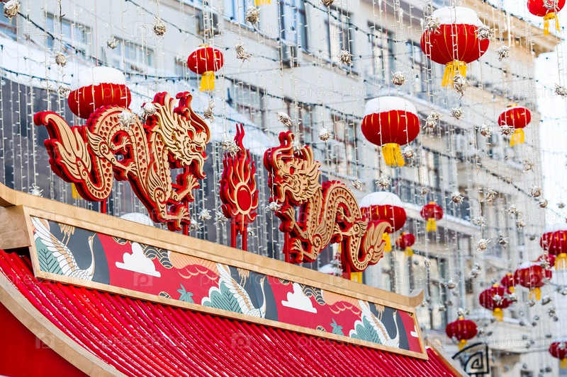 Дракон и китайские красные рождественские фонарики на Тверской улице в Москве. Крупный план. Первая в истории встреча китайского Нового года 2024 в Москве