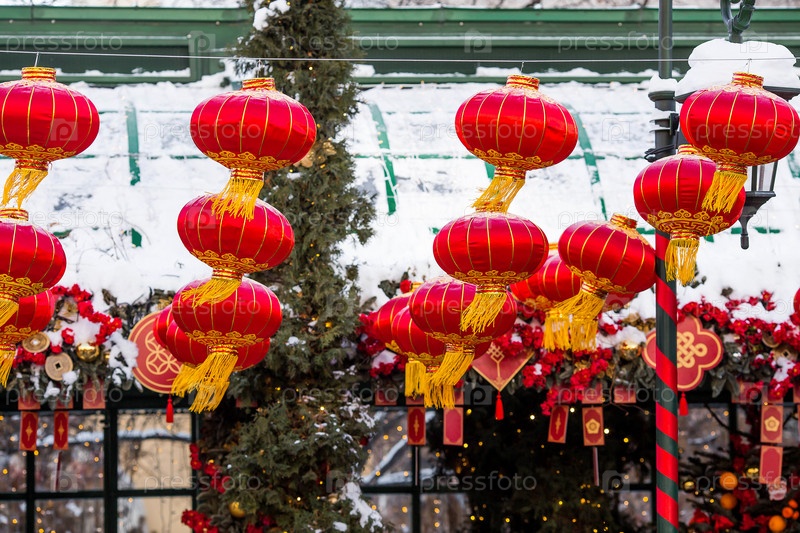 Китайские красные рождественские фонарики на Тверской улице в Москве. Крупный план. Первая в истории встреча китайского Нового года 2024 в Москве