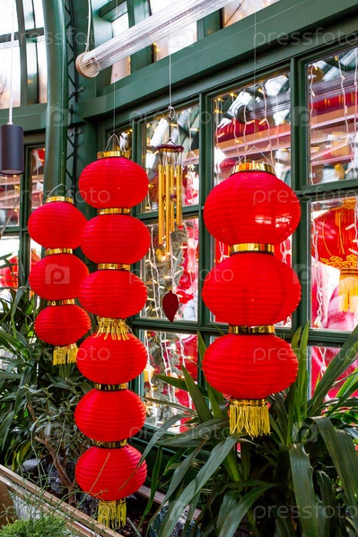 Китайские красные рождественские фонарики на Тверской улице в Москве. Крупный план. Первая в истории встреча китайского Нового года 2024 в Москве