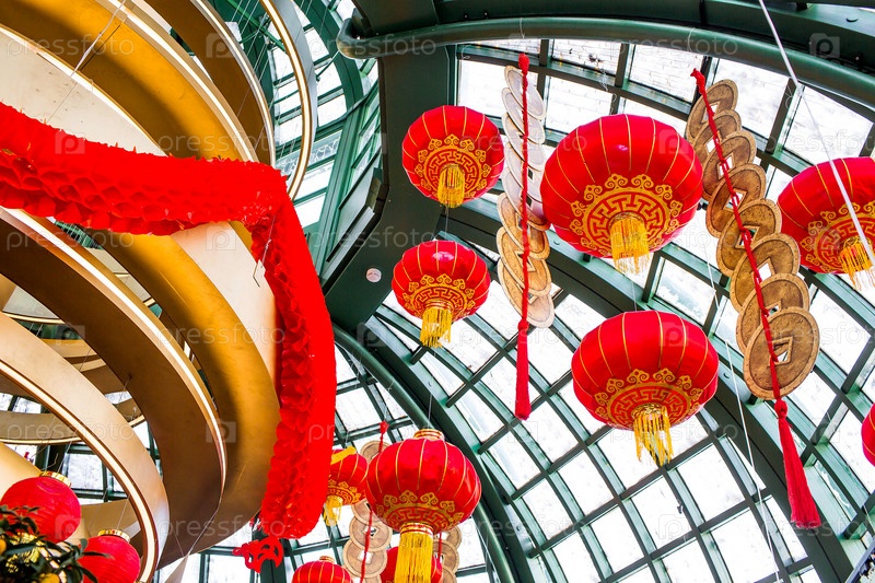 Китайские красные рождественские фонарики на Тверской улице в Москве. Крупный план. Первая в истории встреча китайского Нового года 2024 в Москве