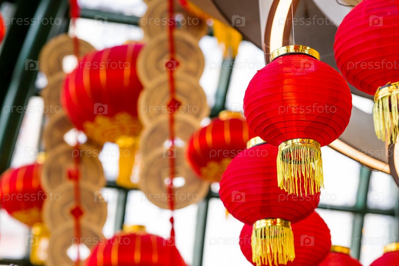 Китайские красные рождественские фонарики на Тверской улице в Москве. Крупный план. Первая в истории встреча китайского Нового года 2024 в Москве