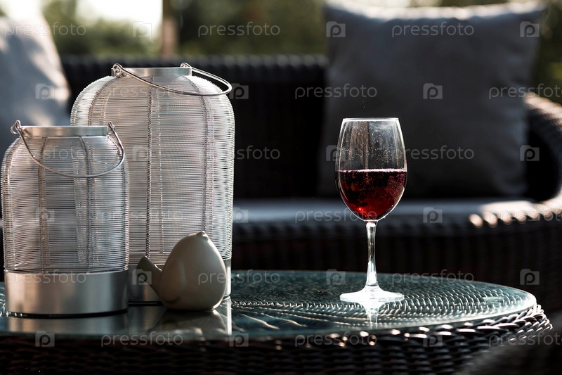 Бокал красного алкогольного напитка или вина на стеклянном столе на веранде. Понятие алкоголизма, вечеринки или праздника