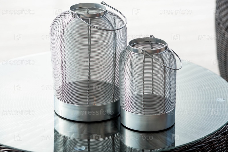Детали интерьера. Минималистичная композиция современного интерьера веранды загородного дома. Два стильных железных подсвечника на стеклянном столе. Патио