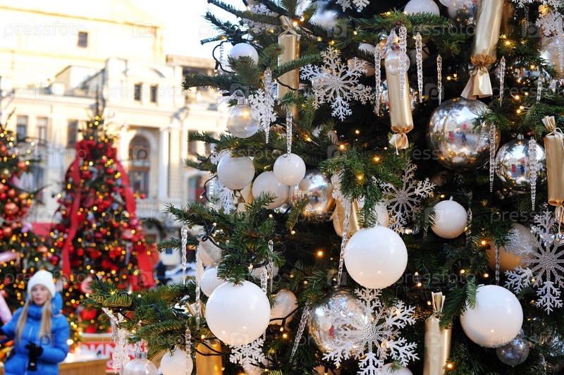 Украшение праздничных новогодних елок в Москве