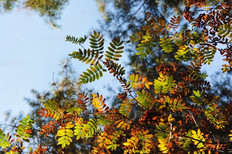 Листья осенней рябины красно-желтые и зеленые