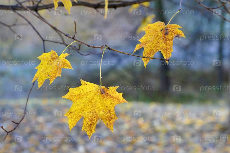 Одинокие желтые кленовые листья на ветке
