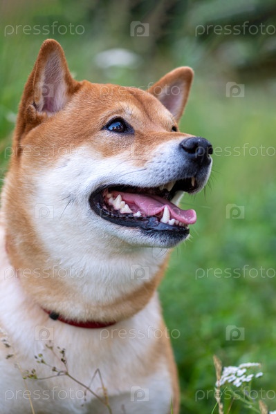 Портрет милой японской собаки породы сиба-ину на фоне зеленой травы