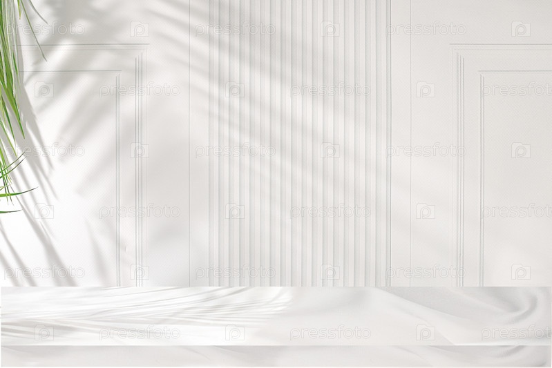 Премиальный пустой подиум с тенями из тропических пальмовых листьев на элегантной серой стене, минимальный абстрактный фон для презентации косметической продукции, шаблон дизайна, подиум на постаменте,