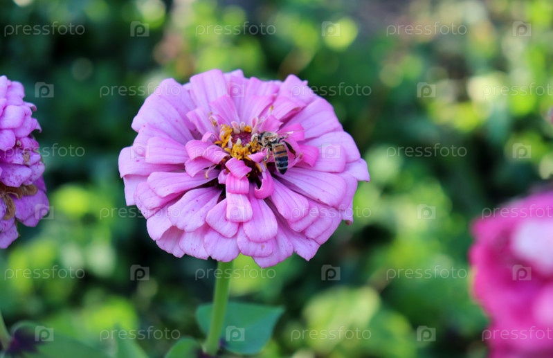 Пчела на розовом цветке циннии на клумбе на фоне листвы в полутени
