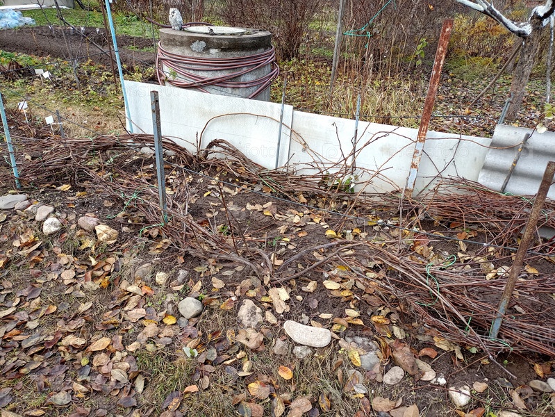 Виноградные лозы прижаты к земле на зиму в саду с опавшими листьями