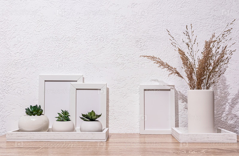 Вид спереди на деревянную поверхность комода с белыми стильными фоторамками, горшки с суккулентами, ваза с сухоцветами. Эко стиль