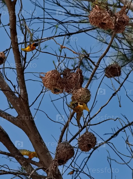 Западная Африка. Сенегал. Африканский желтый ткачик среди колонии сферических гнезд, сделанных из переплетенных травинок и тонких веток