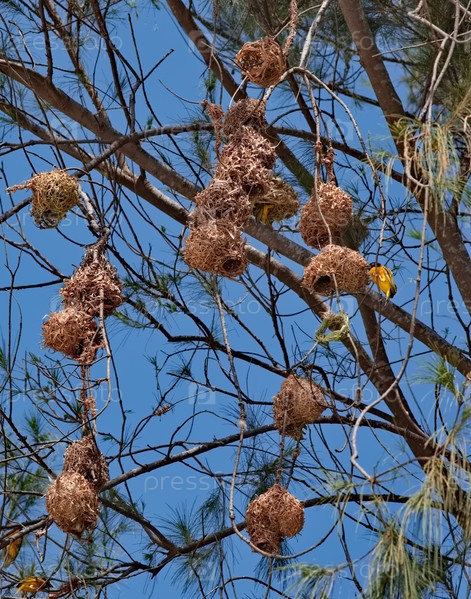 Западная Африка. Сенегал. Африканский желтый ткачик среди колонии сферических гнезд, сделанных из переплетенных травинок и тонких веток