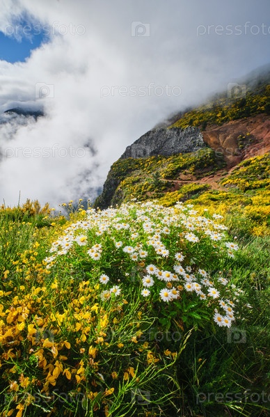 Ландшафт Мадейры с цветами маргаритки и цветущими кустарниками Cytisus, Португалия