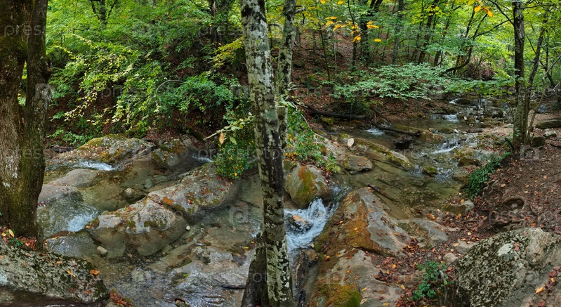 Россия, Республика Крым. Вид на русло реки Улу-Узень в тени скалистых зарослей горного ущелья гидрологического заказника Хапхальский