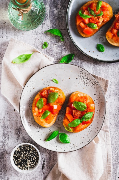 Итальянские сэндвичи с помидорами, базиликом и чесноком на тарелке на столешнице и вертикальный вид