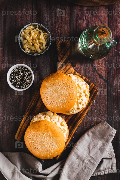 Салат-бургер с яйцами, помидорами, чесноком и сыром на доске на столешнице и вертикальный вид