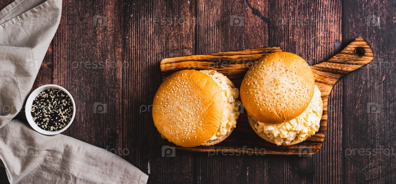 Салат-бургер с яйцами, помидорами, чесноком и сыром на доске на столешнице веб-баннер