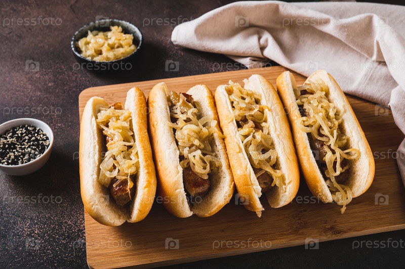 Вкусные хот-доги с говяжьей колбасой и жареным луком на доске