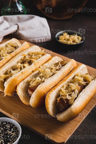 Вкусные хот-доги с говяжьей колбасой и жареным луком на доске вертикальный вид