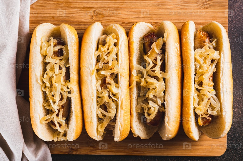 Крупный план хот-догов с карамелизированным луком на доске на столешнице