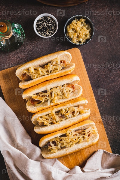 Вкусные хот-доги с говяжьей колбасой и жареным луком на доске сверху и вертикальный вид